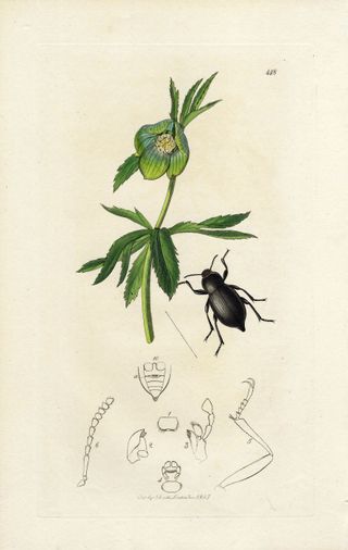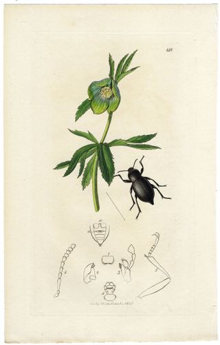 Precioso y antiguo grabado en cobre y coloreado a mano procedente de un volumen de Entomología Británica "British Entomology" de John Curtis (1791-1862) editado en Londres en 1827. John Curtis fue un entomólogo e ilustrador inglés, en 1824 comenzó su monumental obra maestra "Entomología británica", considerada como la mejor obra del siglo XIX sobre sobre el tema. En este grabado vemos al insecto coleóptero Blaps Obtusa junto a la planta con flores Helleborus viridis. Buen estado, impresión nítida y fresca. Coloreado original a mano. Medidas: 24 x 15,5 cm. ¡¡ORIGINAL de 1827!! PL.148.
