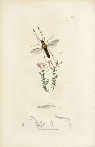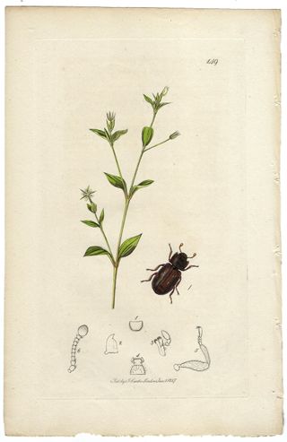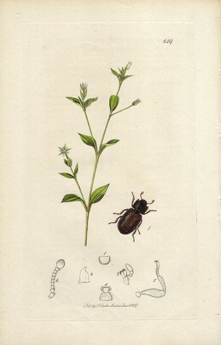 Precioso y antiguo grabado en cobre y coloreado a mano procedente de un volumen de Entomología Británica "British Entomology" de John Curtis (1791-1862) editado en Londres en 1827. John Curtis fue un entomólogo e ilustrador inglés, en 1824 comenzó su monumental obra maestra "Entomología británica", considerada como la mejor obra del siglo XIX sobre sobre el tema. En este grabado vemos al insecto coleóptero CICONIS CARPINI junto a la planta con flores Arenaria trinervis. Buen estado, impresión nítida y fresca. Coloreado original a mano. Medidas: 24 x 15,5 cm. ¡¡ORIGINAL de 1827!! PL.149