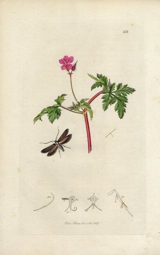 Precioso y antiguo grabado en cobre y coloreado a mano procedente de un volumen de Entomología Británica "British Entomology" de John Curtis (1791-1862) editado en Londres en 1827. John Curtis fue un entomólogo e ilustrador inglés, en 1824 comenzó su monumental obra maestra "Entomología británica", considerada como la mejor obra del siglo XIX sobre sobre el tema. En este grabado vemos al insecto lepidóptero GLYPHIPTERYX LINNEELLA en forma de mariposa junto a la planta con flores GERANIUM ROBERTIANUM. Buen estado, impresión nítida y fresca. Coloreado original a mano. Medidas: 24 x 15,5 cm. ¡¡ORIGINAL de 1827!! PL.152