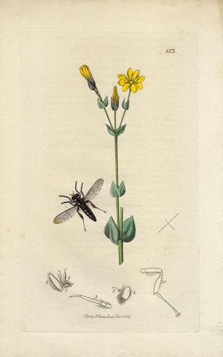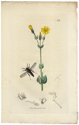 Precioso y antiguo grabado en cobre y coloreado a mano procedente de un volumen de Entomología Británica "British Entomology" de John Curtis (1791-1862) editado en Londres en 1827. John Curtis fue un entomólogo e ilustrador inglés, en 1824 comenzó su monumental obra maestra "Entomología británica", considerada como la mejor obra del siglo XIX sobre sobre el tema. En este grabado vemos al insecto díptero DASYPOGON BREVIROSTRIS junto a la planta con flores CHLORA PERFOLIATA. Buen estado, impresión nítida y fresca. Coloreado original a mano. Medidas: 24 x 15,5 cm. ¡¡ORIGINAL de 1827!! PL.153.