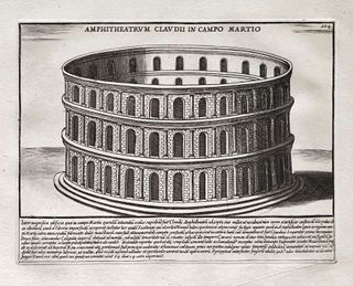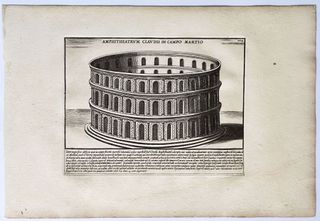 Magnífico grabado de 1699 de Pietro Santi Bartoli (Petrus Sanctius Bartolus) titulado Anfiteatro de Claudio en el Campo de Marte "Amphiteatrum Claudii in Campo Martio". De la obra: "Romanae magnitudinis Monumenta, quae urbem illam orbis dominam velut redivivam exhibant posteritati veterum..." de Domenico de Rossi (1659-1730) con grabados de Pietro Santi Bartoli (1635-1700). Muy buen estado de conservación, con ligeras manchas de foxing. Impresión nítida y clara en papel grueso de calidad con marca de agua. Medidas: 40 x 27 cm. ORIGINAL de 1699 (siglo XVII), no es copia ni reimpresión posterior. AGRUPO ENVÍOS