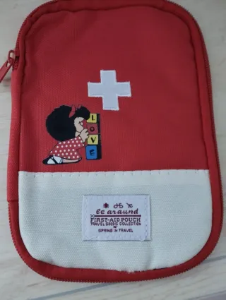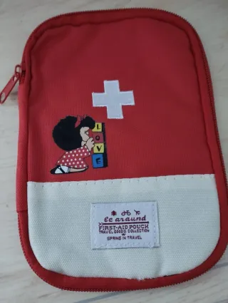 Práctico botiquín de primeros auxilios con diseño de Mafalda. - Color rojo con detalles blancos. - Incluye etiqueta Le araund y Spring in Travel. - Cremallera para cierre. - Medidas 13*18cm. Sin estrenar. Bolsa para medicinas portátil.