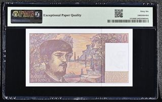 Billete de 20 Francos de Francia, año 1997, con certificación PMG de grado 66 EPQ. - Pick# 151i - Marca de agua: C. Debussy - Firmas: Bruneel, Bonnardin, Barroux - Número de serie: Y.058 340142