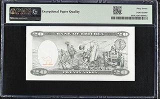 Billete de 20 Nakfa de Eritrea del año 1997, certificado por PMG con una calificación de 67 EPQ. - Serie: AA9661524 - Emisor: Bank of Eritrea - Diseño: Camel's Head - Fecha de emisión: 24.5.1997