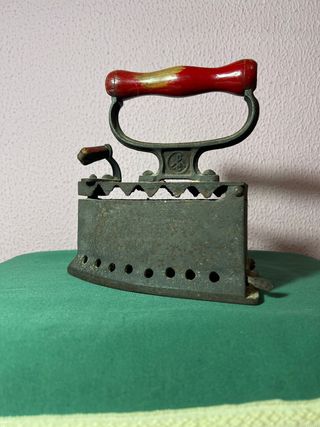 Plancha de hierro antigua con un distintivo mango rojo. Un objeto con carácter para coleccionistas o decoración. - Material: Hierro fundido. - Mango: Madera pintada en rojo y detalles en madera natural.