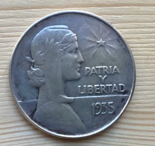 Moneda de 1 peso de Cuba del año 1935. Presenta un diseño con la figura de una mujer y la inscripción Patria y Libertad. - Año: 1935 - Denominación: 1 Peso - País: Cuba