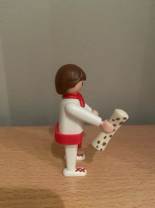 Figura de Playmobil de San Fermín. - Viste el traje blanco típico con pañuelo y faja rojos. - Sostiene un pergamino en la mano.