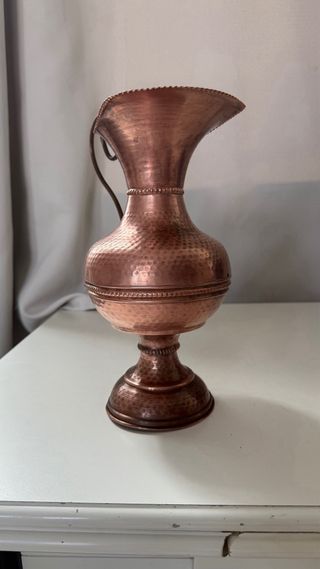Preciosa jarra de cobre, con un diseño antiguo y elegante. Ideal para decoración. - Acabado martillado. - Asa de diseño curvado. - Base robusta.