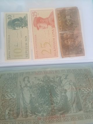 Billete de 1000 Coronas del Imperio Austrohúngaro, emitido en 1902. - Diseño detallado con águila bicéfala. - Retrato femenino en el anverso. - Texto en varios idiomas, incluyendo alemán y húngaro.