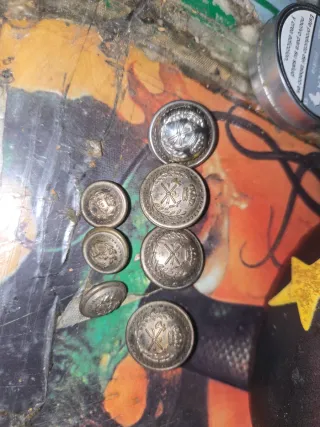 Conjunto de ocho botones antiguos con diseño militar. Presentan un grabado detallado epoca alfonso. - ocho botones metálicos. - Diseño con motivos militares y corona. Oferta los 8 !!!