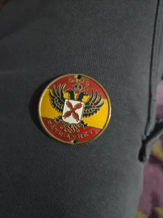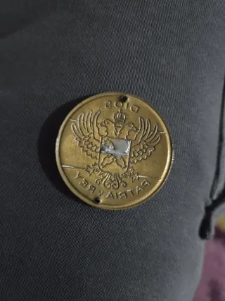 Insignia metálica con el lema Dios, Patria, Rey. - Diseño circular con águila bicéfala. - Colores rojo, amarillo y blanco. - Dos agujeros para sujeción.coleccion!!