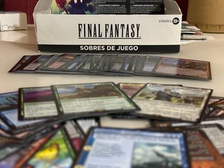 Caja de sobres de juego de Magic The Gathering, edición Final Fantasy. Las compré para jugar con mi hermano por recordar viejos tiempos. Ni las colecciono ni las quiero en casa. Lo abrimos, jugamos unas partidas y ya, están nuevas. FALTAN 2 CARTAS (miramos en internet cuales eran las más caras de la colección y había dos, las vendimos por separado por casi 100 euros). NO PREGUNTAR SI ESTÁ ÉSTA O AQUELLA. EL QUE QUIERA SABER QUE LO COMPRE. Esta todo tal cual, con sus cartas foil, sus fichas y eso. La caja esta un poco rota por la esquina (se ve en la foto) #MTG #Final Fantasy #Booster Pack