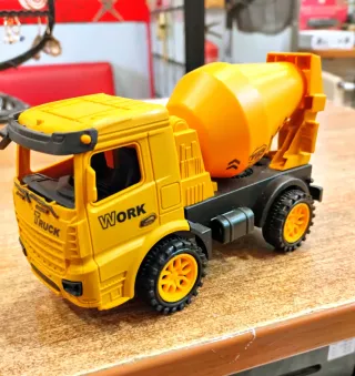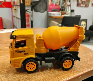 Camión hormigonera en color amarillo. - Diseño detallado con cabina y tambor giratorio. - Ruedas negras con detalles naranjas. - Inscripción WORK en la puerta.