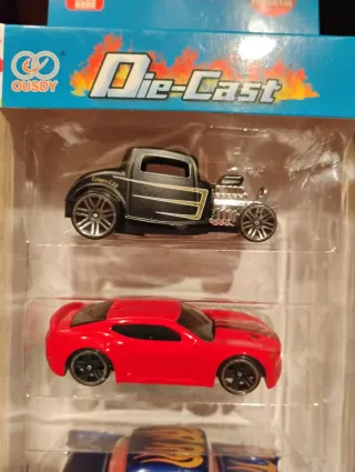 Pack de 4 coches de juguete Die-Cast. - Coche estilo hot rod negro. - Coche deportivo rojo. - Coche clásico azul con llamas. - Coche de carreras blanco y azul.