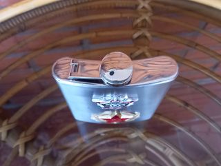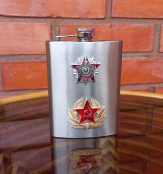 Petaca de acero inoxidable con diseño ruso. Presenta dos distintivos metálicos. Mide 12,2 cm de alto/ 9,1 cm de ancho. - Diseño: Emblemas rusos. #petacaacero #petacarusia