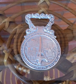 Abre Botellas, Vintage. Mide 8,8 cm/5,3 cm. - Representación de monumentos icónicos de París. - Acabado metálico plateado. - Asa decorada con motivos ornamentales.