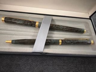 Elegante conjunto de bolígrafo y pluma Inoxcrom. chapado oro 23 kilates , sin utilizar - Diseño clásico con detalles dorados. - Acabado en tonos oscuros y marmoleados. verdosos - Incluye estuche original.