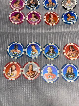 Colección de fichas de tazo Chipz WWE del año 2008, estilo fichas de poker. - Incluye luchadores como Rey Mysterio, Batista, Undertaker, Umaga, Jeff Hardy, Shawn Michaels, Edge, Queen Sharmell, Deuce, Finlay, Victoria, Mickie James, Snitsky, y Fuakaki. - Cada ficha tiene un diseño único con la imagen del luchador y su nombre.