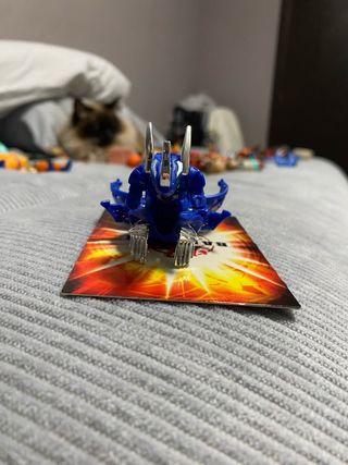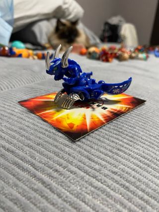 Figura de acción Bakugan, modelo Dragón. - Color azul metálico. - Detalles plateados en cuernos y patas. - Incluye carta de juego. - Diseño inspirado en un dragón.