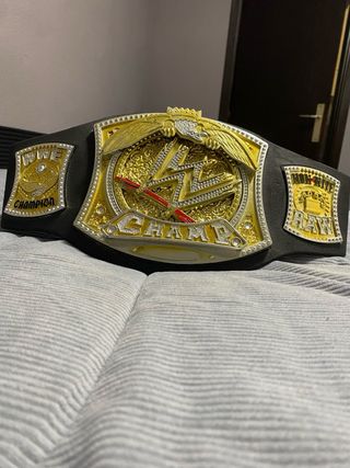 cinturón WWE Championship estilo spinner. Un accesorio icónico para coleccionistas. - Placas doradas con detalles. - Correa negra. - Diseño central giratorio.