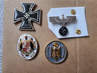 Conjunto de cuatro pines politicos. - Pin con forma de cruz negra y esvástica. - Pin con águila plateada y esvástica. - Pin ovalado con escudo España. - Pin circular y texto 'POLICIA ARMADA'.