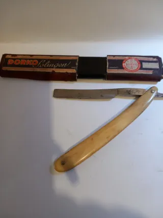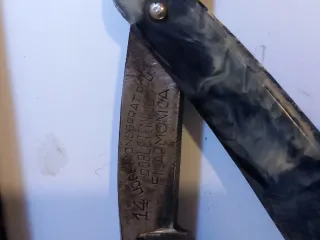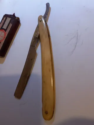 Navaja de afeitar antigua, la foto de la marca no es la de esta navaja ya que como muestro en otras fotos se ve muy mal - Hoja de metal. - Mango de material marfil/baquelita.
