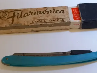 Navaja de afeitar Filarmónica, modelo Doble Temple de José Monserrat Pou. La hoja es de acero y el mango es de color azul. - Hoja de acero. - Mango de color azul.