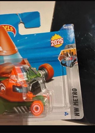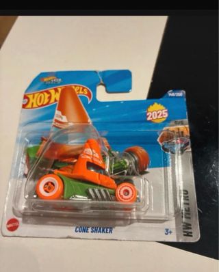 Lote de dos coches Hot Wheels nuevos en su embalaje original. Incluye el modelo Cone Shaker con diseño naranja y verde, y una moto Honda. - Coche Hot Wheels Cone Shaker. - Moto Honda. - Nuevos en blíster.