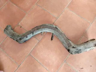 Pieza antigua de madera con refuerzos de metal. - Material: Madera y metal. - Diseño curvo y rústico.