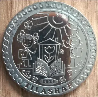 Moneda conmemorativa del año 2021. Dedicada a Tiralasar Valor 100 tenge - Diseño infantil con sol, casa, niños y libros. - Borde decorativo con ondas y flores. - Inscripción TILASHAR en la parte inferior.