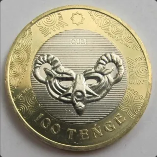 Moneda conmemorativa de 100 Tenge. Dedicada a la máscara Chilkty - Diseño central de un carnero con cuernos. - Inscripción 100 TENGE en la parte inferior. - Borde exterior con motivos ornamentales. - Inscripción QUBE en la parte superior central.