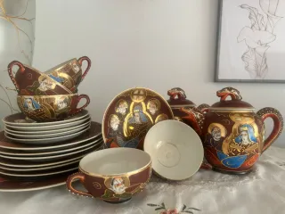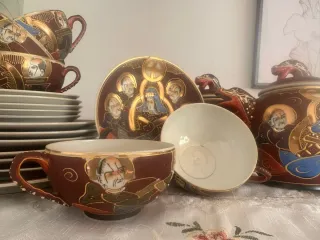 Conjunto de porcelana china con un diseño detallado y elegante. - Incluye tazas, platos y tetera. - Decoración con figuras y motivos dorados. - Piezas de alta calidad.