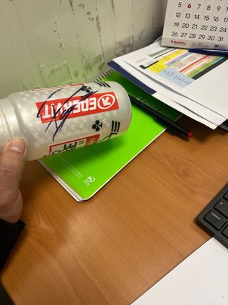 Bidón de ciclismo del equipo UAE Emirates, firmado por Tadej Pogacar. Es un artículo de colección para aficionados al ciclismo. - Firmado por Tadej Pogacar. - Diseño del equipo UAE Emirates. - Usado por Tadej Pogacar