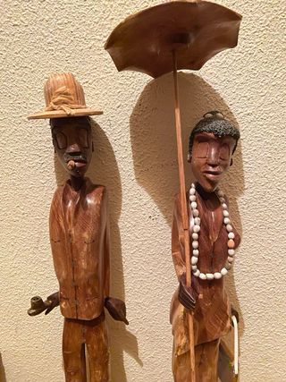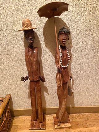Conjunto de dos figuras talladas en madera, que representan a un hombre y una mujer vestidos al estilo cubano del siglo XIX. Sobre peana de madera, la cual lleva tallado la palabra “Cuba”. La figura masculina con sombrero, cigarro y pipa en la mano. La figura femenina con collar, bolso y sombrilla. Comprados en La Habana Son grandes, de 72x11 cm cada figura aprox. (La medida en las 2 ultimas fotos).