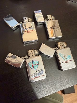 Conjunto de 4 mecheros Zippo con diferentes diseños.