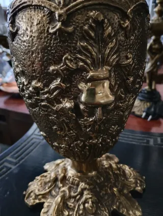 Elegante jarra antigua de bronce con un intrincado tallado. Bronce o hierro bañado. Pesa unos 8 kilos