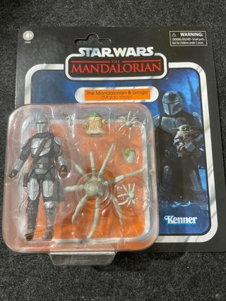 Figura de acción de Star Wars: The Mandalorian, con Grogu y accesorios. - Personajes: The Mandalorian y Grogu (Maldo Kreis). - Incluye accesorios como armas y criaturas. - Empaque estilo retro Kenner.