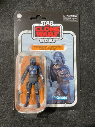 Figura de acción de Mandalorian Death Watch Airborne Trooper de la serie Star Wars: The Clone Wars. Presentada en su empaque original. - Figura detallada del personaje. - Incluye accesorio. - Empaque estilo retro. - Marca Kenner.