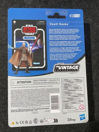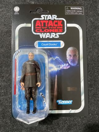 Figura de acción de Count Dooku de la película Star Wars: El Ataque de los Clones. - Empaque estilo vintage. - Incluye sable de luz rojo y accesorio plateado.