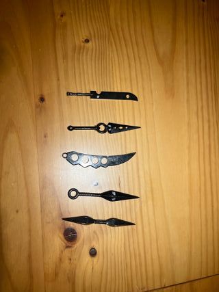 Conjunto de cuchillos de juguete o adorno característicos de la serie Naruto - Diseño metálico negro. - Incluye varios modelos de cuchillos y shurikens.
