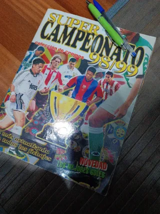 Colección de cromos del Super Campeonato de la temporada 98/99. Tiene 184 cromos pegados - Cromos de fútbol de la temporada 98/99. Tiene un nombre escrito en la portada Album de cromos de futbol liga española Flexo aplique Panini mundicromo de la liga romántica fichas de la historia