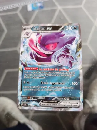 Carta Pokémon Gengar EX de la expansión Scarlet & Violet. - Habilidad: La maldición de gnawing. - Ataque: Pasos ingeniosos (160). - Debilidad: x2. - Resistencia: - - Retirada: 2. - Regla para las Pokémon EX: Cuando tu Pokémon EX queda Fuera de Combate, tu rival coge 2 cartas de Premio. - Ilustrador: Nisata Nisa.