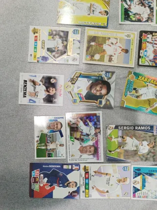 Colección de cromos del Real Madrid. - Incluye jugadores como Benzema, Cristiano Ronaldo, Modric, Ramos, Casillas, Rodrygo, Valverde, Odriozola, Jovic, Casemiro y Özil. - Diversas ediciones como Mega Fichajes, Mega Estrellas y Hero. - Cromos de diferentes temporadas y colecciones como Pichichi y Liga. Album de cromos de futbol liga española Flexo aplique Panini mundicromo de la liga romántica fichas de la historia