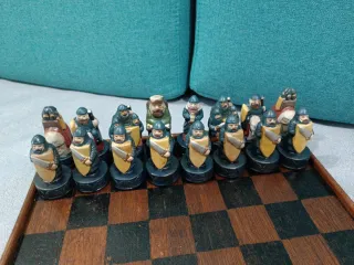 Set de ajedrez con figuras de cerámica de estilo medieval. - Piezas de cerámica detalladas. - Diseño inspirado en la época medieval. Va con un tablero de los años 50 o 60 que tiene una grieta y algún daño por el tiempo No Correos!!! Album de cromos de futbol liga española Flexo aplique Panini mundicromo de la liga romántica fichas de la historia