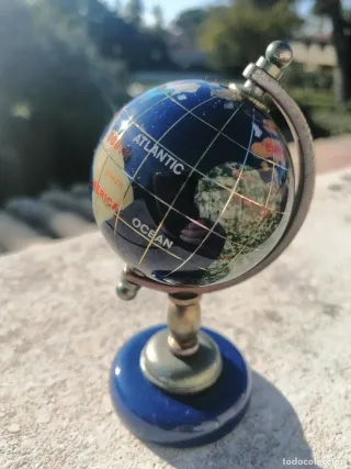 Especial y pequeño globo terráqueo Azul de Lapislazuli, color Royal Blue, hecho a mano con incrustaciones de piedras semi preciosas, los meridianos están incrustados con un hilo de oro. Las piedras incluyen jaspe, ojo de tigre, aventurina, jade oriental, nácar, turquesa, unakita, obsidiana, howalita y concha paua. Es muy bonito y hermoso para estar en una vitrina, si está al sol e incide en las piedras tiene un brillo en la madreselva precioso. Es antiguo y está tal como se ve en las fotografías