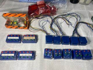 Incluye: • 4 módulos Märklin ref. 7072 Hechos en Alemania Pupitres de mando con 4 pulsadores Usados en maquetas ferroviarias analógicas • 10 módulos Aneste (España) Módulos de control con pulsadores e indicadores luminosos. Algunos numerados y otros sin numerar. • 16 conectores multipin rojos Para paneles y conexiones múltiple. • 87 fundas aislantes de colores Para conectores tipo banana Colores variados (rojo, verde, amarillo) Escucho ofertas razonables.