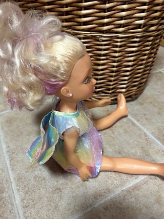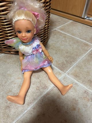 Muñeca Nancy con temática de hada, lista para vivir aventuras mágicas. - Vestido de colores pastel con detalles brillantes. - Alas de hada translúcidas. - Pelo rubio recogido con lazo rosa.