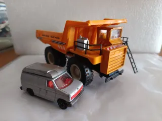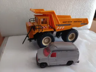 Set de dos vehículos a escala. - Camión dumper de color naranja. - Furgoneta plateada de la marca Majorette. para recrear diorama de trabajo.
