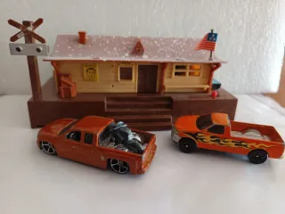 Diorama de una estación de tren a escala 1/64. - Incluye dos camionetas de hot wheels. - La estación tiene detalles como un cartel de Se busca y una bandera. - Incluye una señal de cruce de vías. - la estacion tiene un motor que con aceite saca humo de la chimenea. funciona y hace ruido de timbre.