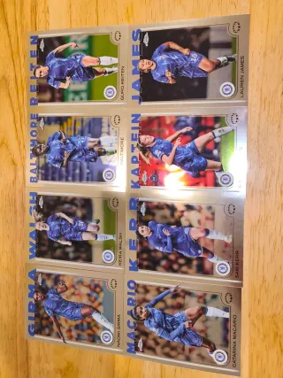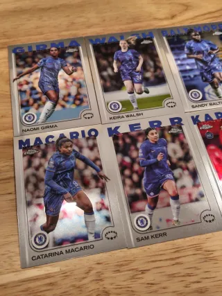 Lote de cromos Topps Chrome UWCL de la temporada 2024/25 del Chelsea. - Incluye cartas de jugadoras como Guro Reiten, Lauren James, Catarina Macario, Sam Kerr, Naomi Girma, Keira Walsh. - Cromos de colección del equipo Chelsea. Precio individual 1,50€ tarjeta